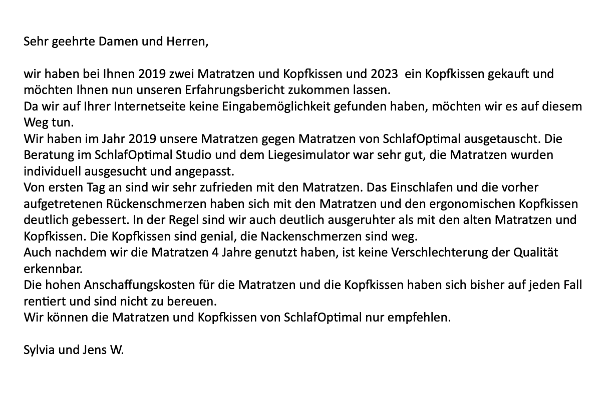 “"...ich bin mit der Bettausstattung von Schlaf Optimal außerordentlich zufrieden. ... Die Beratung und der Service war und ist überzeugend. ... Ich kann jedem dieses System von Schlaf Optimal sehr empfehlen. ..."”