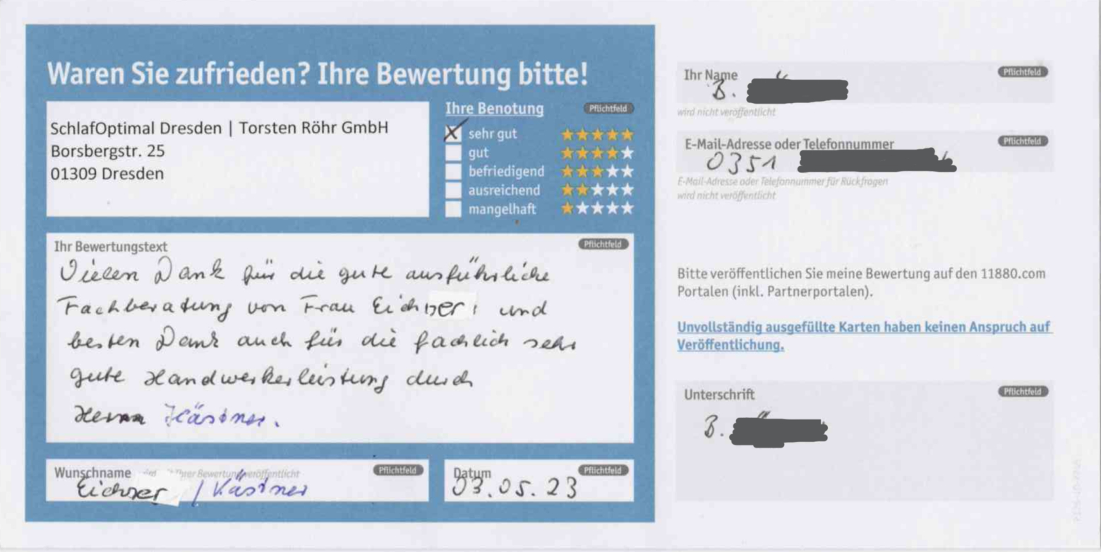 “"Neue Matratze - neues Liegegefühl - einfach herrlich! ... Dank an das Team von Schlaf Optimal. ..."”